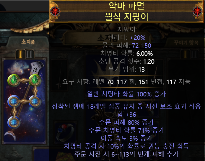 리그스타터로 키웠던 싸클CWC블볼 트릭스터입니다. 기본적으로 피직뎀을 콜뎀으로 컨버트한뒤에 카뎀게인을 땡긴 빌드입니다. CI에쉴 빌드였구요. 이번 리그에 싸클이 채널링 스킬로 바뀌고 편의성 면에서 엄청 버프를 먹었었죠. 그래서 모두 순수 싸클로 몰려들었습니다. 거기서 힙스터 홍대병에 걸린것인지 순수 싸클은 하기 싫고 싸클 스킬은 써보고싶어서 이런 빌드를 하게 되었네요. 중요한건 데미지도 그렇게 강한 느낌이 들지 않고, 그렇다고 몸이 좋은것도 아니라서 엔드에 도전하기 너무 힘들었습니다. 그래서 14티어 이상 돌다가 접었어요. 너무 끔살이 심하더라구요.