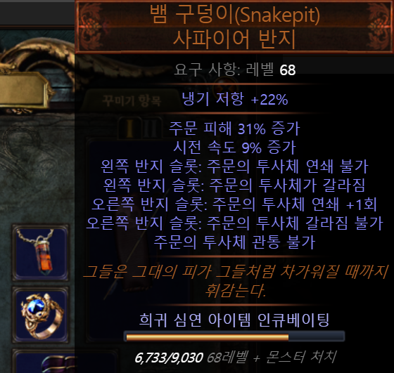 아이템 옵션이 언제바뀐지도 모르겠는 반지입니다. 옛날에는 옵션이 투사체 2개 증가인가? 그랬었거든요. 그래서 프리징펄스 빌드 같은 거 할때 코어템으로 썼던 템입니다. 근데 이제는 체인과 포크옵션으로 바뀌었네요. 이 링으로 체인을 증가시키고 데드아이 어센던시로 또 체인을 1증가시키고, 활통에서도 커럽옵션으로 체인을 챙기는 증 계속 체인을 땡겨줍니다. 근데 활통 커럽옵션은 엄청 비싸니 패쓰.