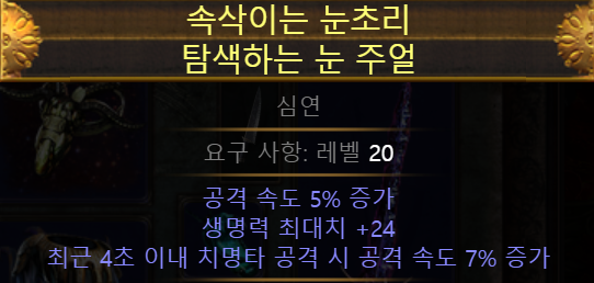 이 빌드에는 심연주얼을 포함하여 총 8개의 주얼이 사용됩니다. 그 중 와쳐와 군단, 그리고 유닉주얼로 3자리를 잡아먹습니다. 나머지 5자리에서 공속을 챙겨야하는거에요. 따라서 슬롯의 여유가 없기때문에 정확도를 위해 착용했던 '조절된 마음' 주얼은 사용하지 않습니다. 정확도를 챙기는 방법은 다음에 서술할게요.