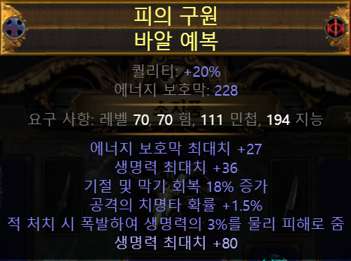 갑옷과 마찬가지로 의미는 없지만 변동점은 있기에 적습니다. 순수하게 저항과 탱킹을 맞추기 위한 부위입니다. 정말 저항챙기기가 빡빡한 세팅입니다. 전 화염/번개저항에 적절한 생명력이 붙은 명계의 조임쇠에 대속자 엑잘을 발라봤습니다. 아쉽게 꼴등상이었어요.